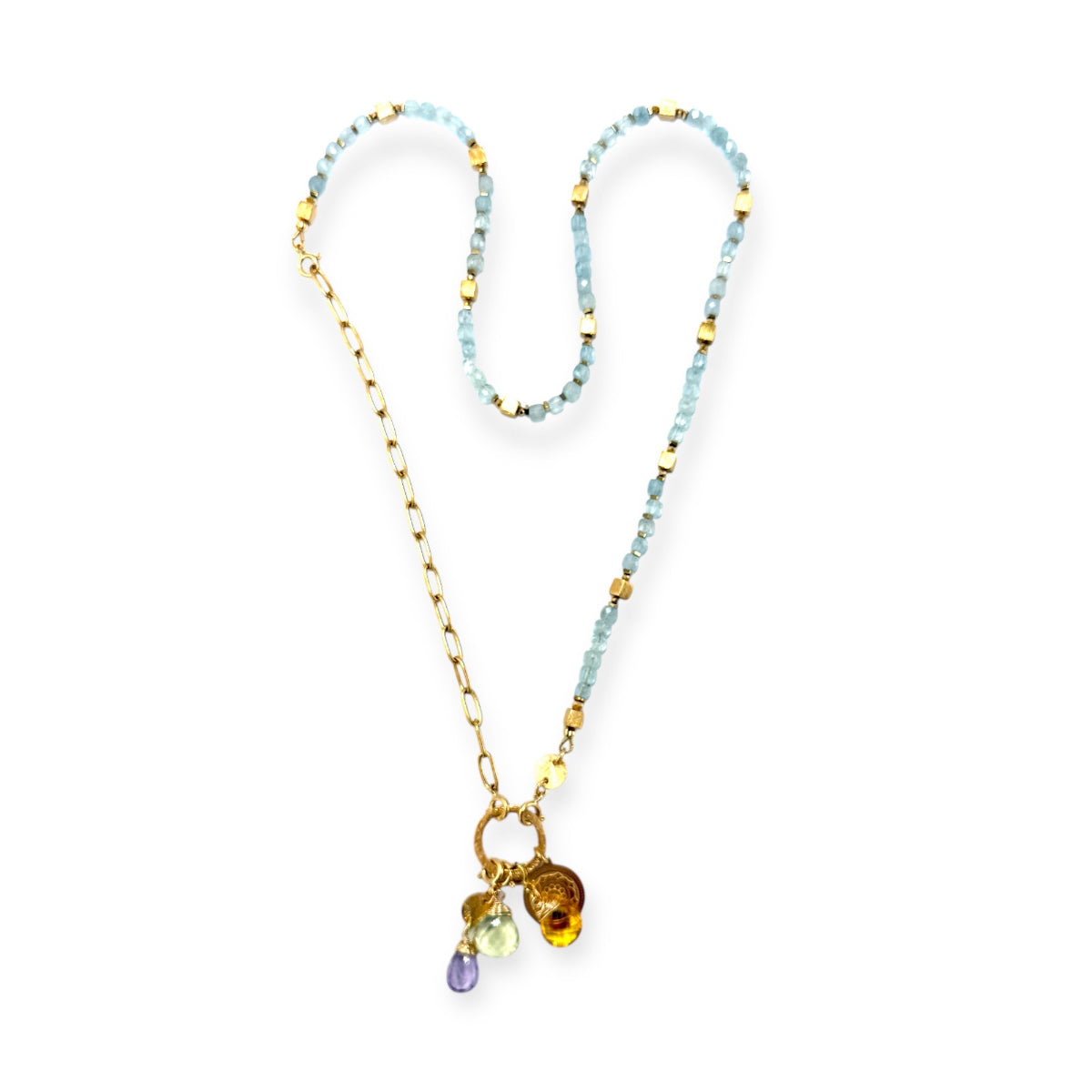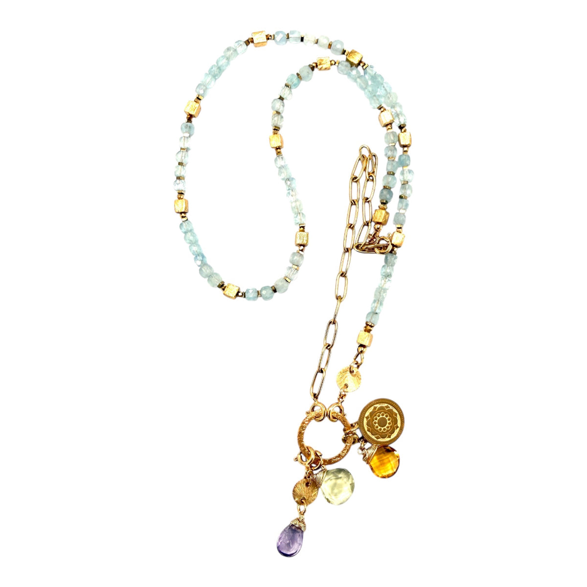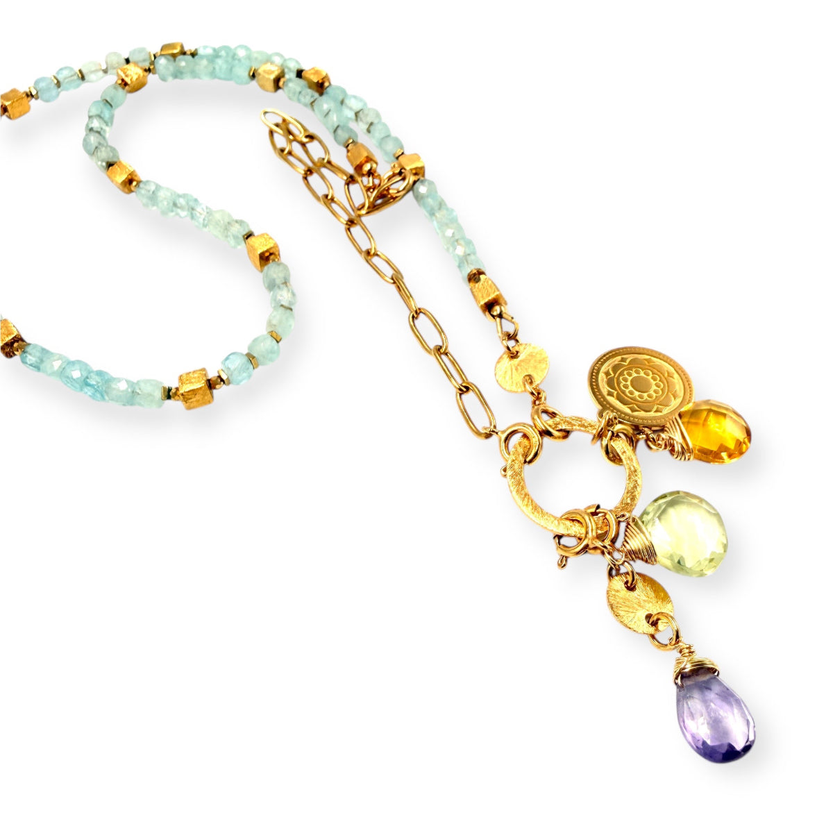 Naszyjnik z naturalnych akwamarynów, ręcznie wykonany. Pełen blasku i splendoru, ten unikatowy klejnot będzie nie tylko dostarczał wytwornych wrażeń estetycznych ale co ważne dział energetycznie w każdym momencie twojej potrzeby duszy.
