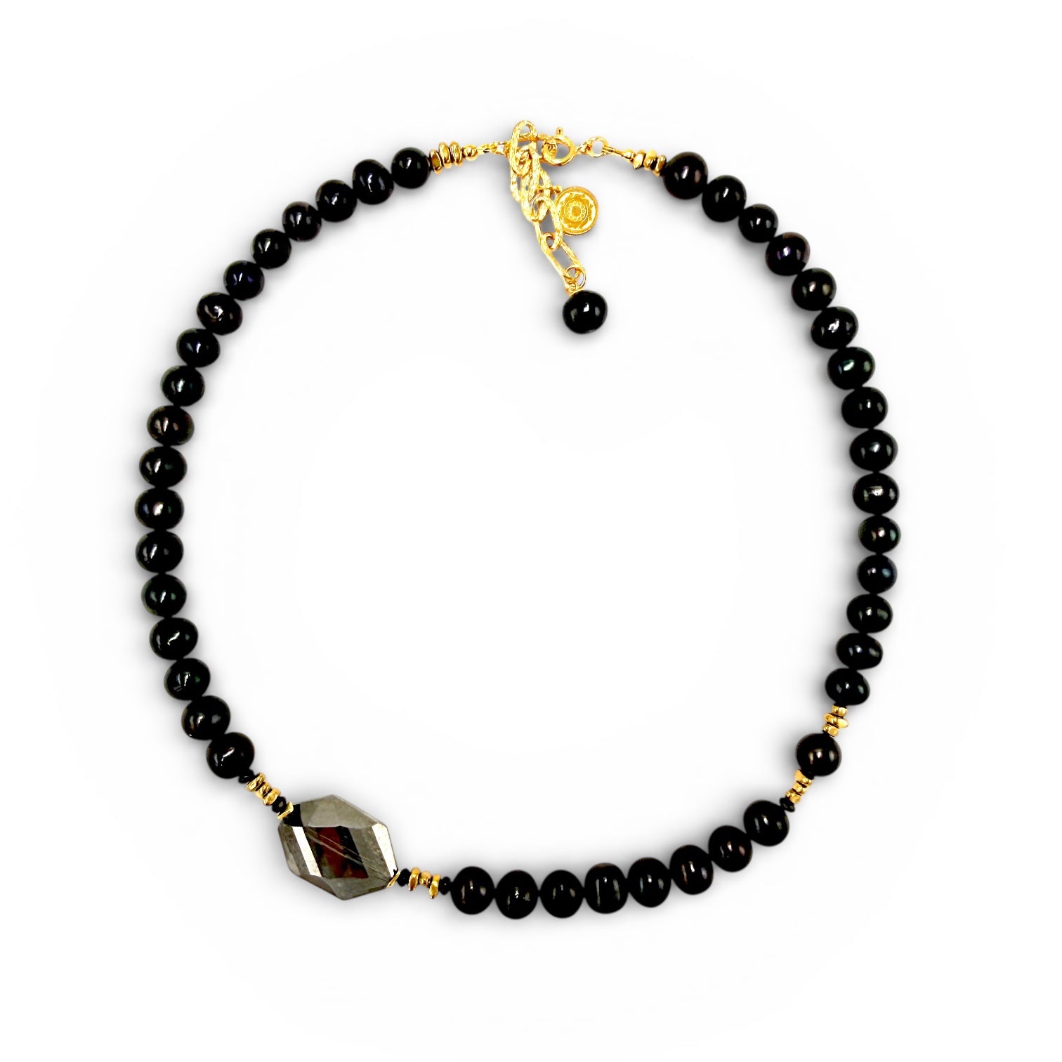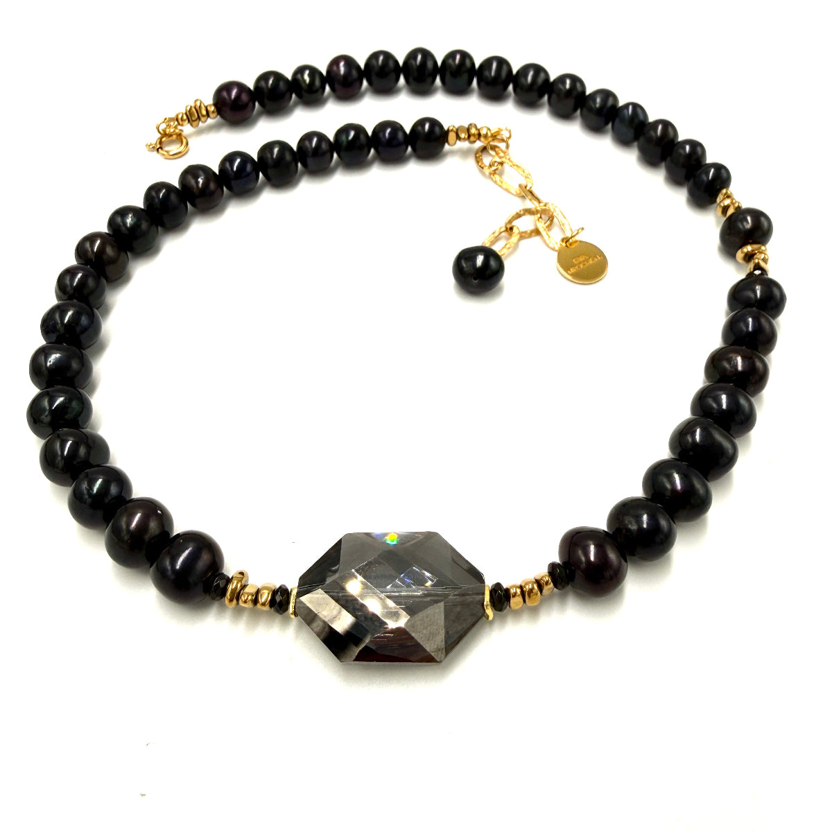 Kolekcjonerski naszyjnik z luksusowej Czarnej Perły z Centralnym Fasetowanym Kryształem, nadającym dziełu splendoru i prestiżu, otulony złoconymi akcentami rozświetlającymi całość kompozycji.