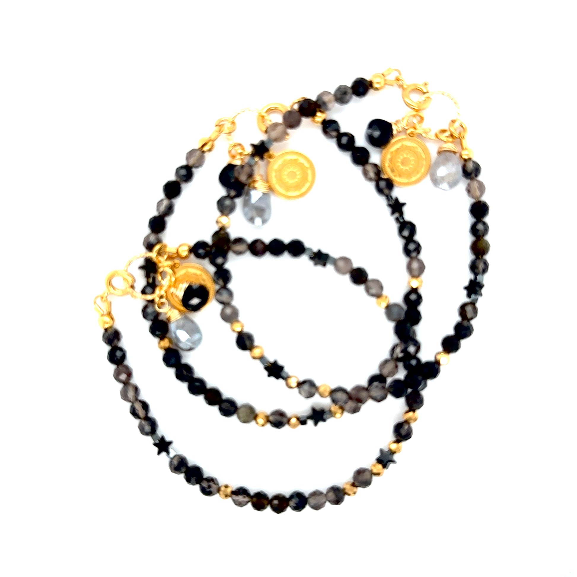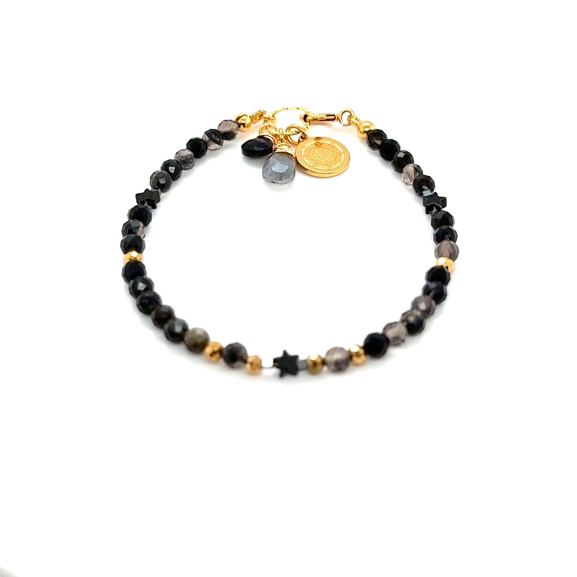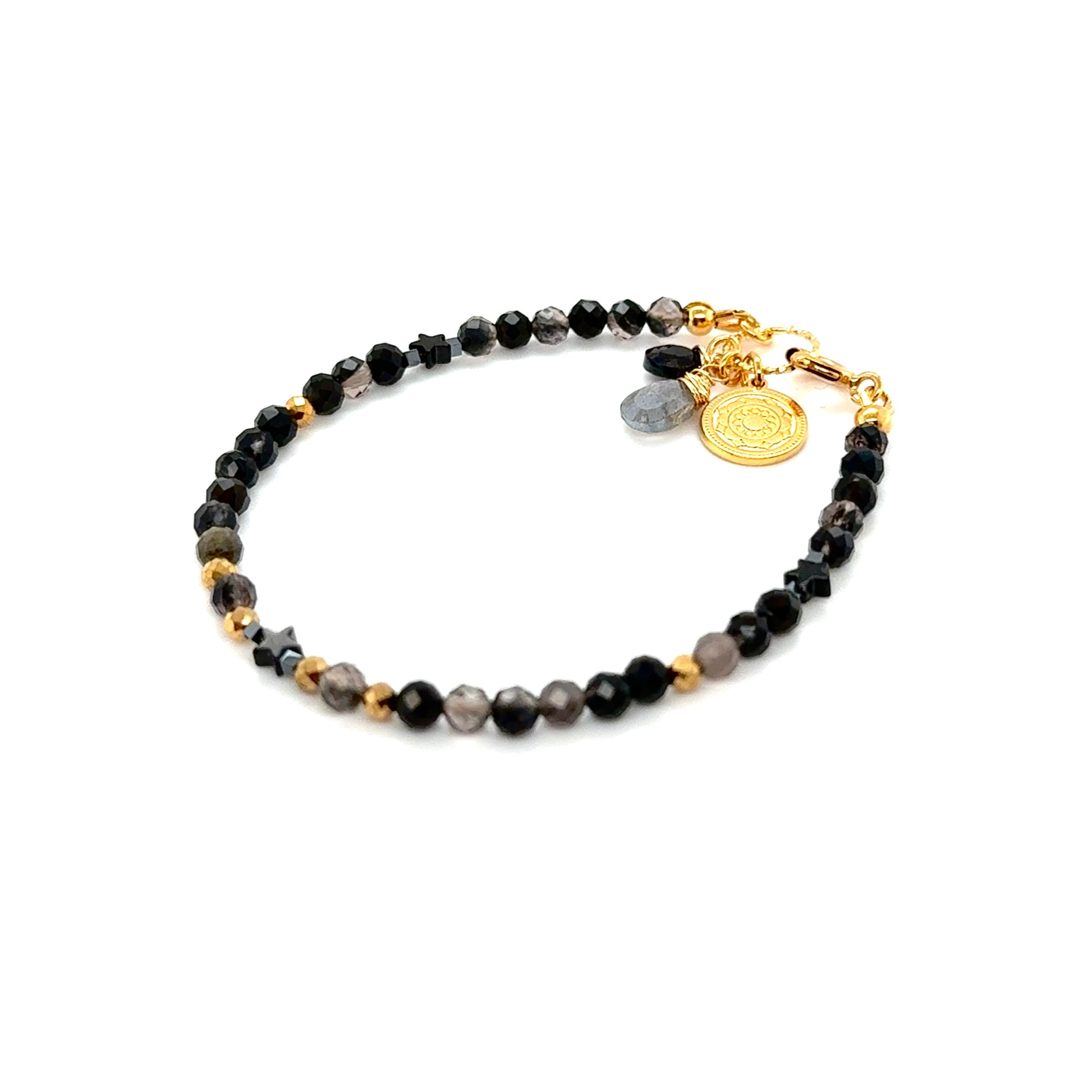 Delikatna bransoletka zapinana, ręcznie wykonana z naturalnego fasetowanego Obsydianu w towarzystwie, Labradorytu zwanego Świątynią Gwiazd, Czarnego spinela  - arystokraty wśród klejnotów ochronnych, który szczególnie zadba o komfort i spokój Twojej przestrzeni  osobistej.